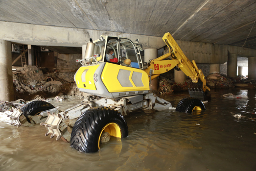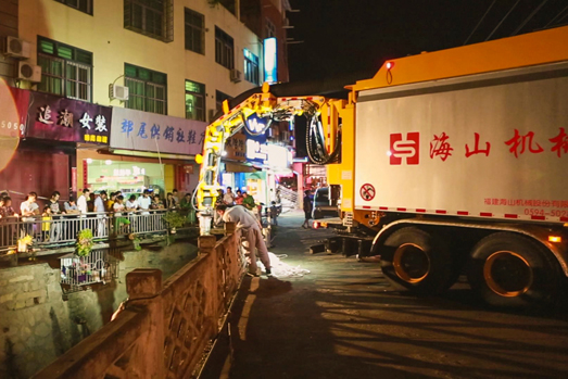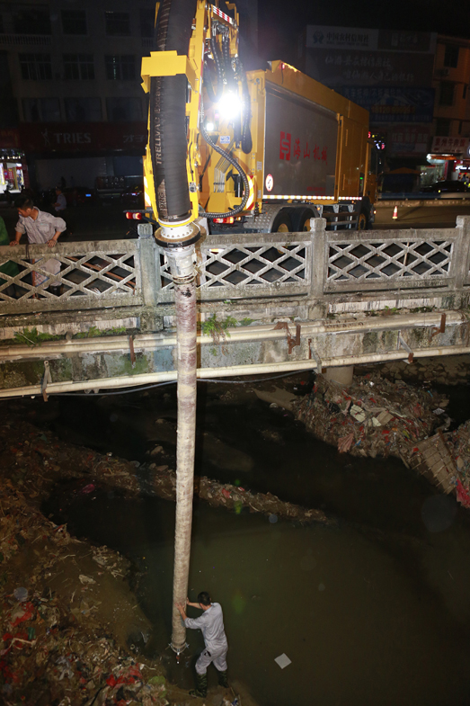 在第14號(hào)臺(tái)風(fēng)“莫蘭蒂”來臨之際,海山機(jī)械緊急出動(dòng)高端應(yīng)急救援裝備——非破壞性挖掘抽吸車和步履工作平臺(tái)趕赴仙游郊尾鎮(zhèn),對一座大橋下堵塞嚴(yán)重的河道進(jìn)行清理。本次施工運(yùn)用抽吸車和步履工作平臺(tái)聯(lián)合作業(yè),發(fā)揮抽吸車長距離作業(yè)、強(qiáng)力抽吸和步履的機(jī)動(dòng)靈活、全地形通過、“上山下河”特點(diǎn),解決了普通機(jī)械設(shè)備無法進(jìn)入河道和清理出來的垃圾物無法運(yùn)輸?shù)碾y題。經(jīng)過設(shè)備的緊急挖掘、抽吸疏通,使堵塞嚴(yán)重的河道保持暢通,確保暴雨來臨時(shí)河道水流暢通。