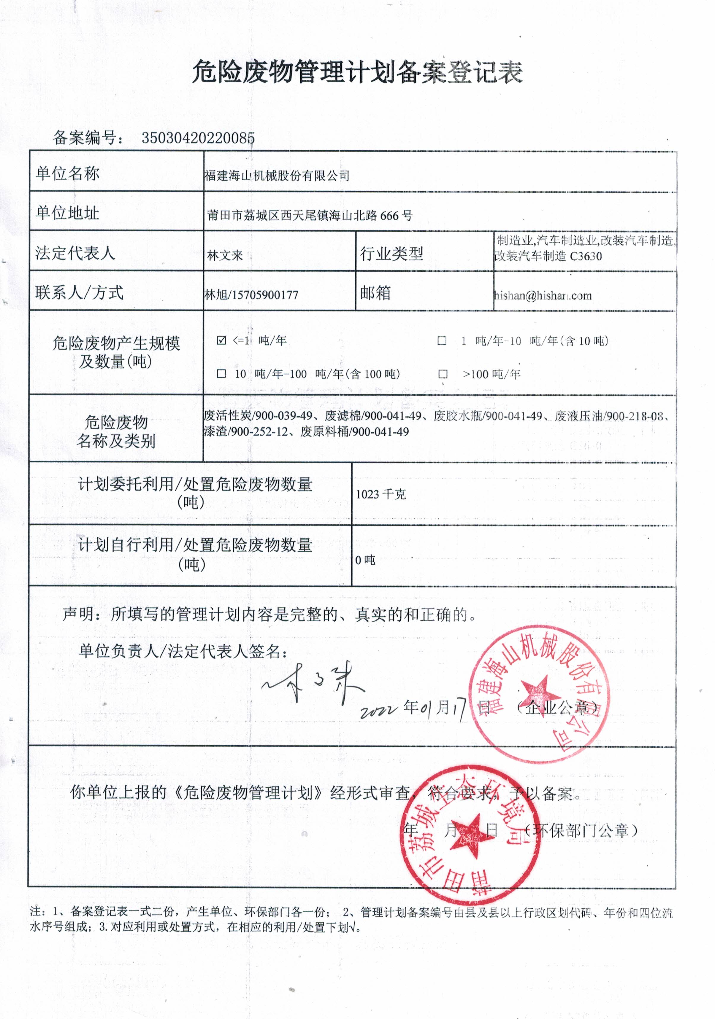 我司于2022年01月14日制定了《2022年度危險廢物管理計劃》,于2022年01月17日提交莆田市荔城生態(tài)環(huán)境局備案。 如下圖: