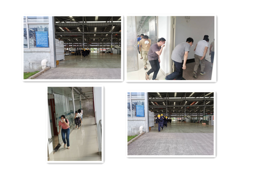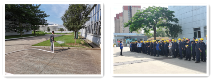 1、2022年6月24日下午14:30分左右,公司廠內(nèi)制造車間因車輛添加液壓油時(shí),不小心飛濺一些到放置車底下的紙皮上,調(diào)試人員未及時(shí)將含有液壓油的紙皮按要求進(jìn)行處理。該車輛剛好有一項(xiàng)技改項(xiàng)目需要完成,配焊人員在焊接前未注意觀察車底情況,導(dǎo)致在焊接時(shí)火星不斷飛濺到含油紙皮上,于14:55分左右出現(xiàn)火情?,F(xiàn)場應(yīng)急人員立即組織消防逃生及滅火,并立即報(bào)告應(yīng)急辦公室,由應(yīng)急辦公室立即向應(yīng)急指揮部報(bào)告。應(yīng)急指揮部根據(jù)初期火情控制情況(應(yīng)急救援人員滅火得當(dāng),于14:56分左右使用滅火器將火撲滅)及預(yù)警級別(車間級),啟動(dòng)車間級應(yīng)急響應(yīng)。相關(guān)部門配合做好應(yīng)急響應(yīng)工作,待達(dá)到應(yīng)急終止條件后,終止應(yīng)急響應(yīng)。最后對現(xiàn)場進(jìn)行洗消、并進(jìn)行工作總結(jié)與評估。突發(fā)環(huán)境事件應(yīng)急預(yù)案演練圖片如下: